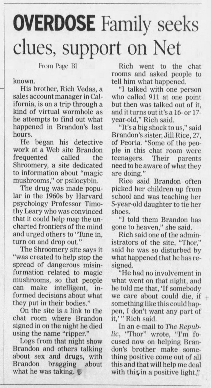 Brandon Carl Vedas (April 21, 1981 – January 12, 2003), also known by his nickname ripper on IRC, of Phoenix, Arizona, United States, was a computer enthusiast, recreational drug user and member of the Shroomery.org community who died of an overdose of prescription drugs while discussing what he was doing via chat and webcam. His death led to debate about the responsibilities and roles of online communities in life-threatening situations.