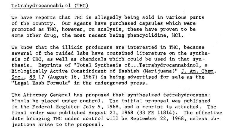 We know that the illicit producers are interested in THC, because several of the raided labs have contained literature on the synthesis of THC, as well as chemicals which could be used in that syn-thesis. Reprints of "Total Synthesis of...Tetrahydrocannabinol, a Biologically Active Constitiuent of Hashish (Marijuana)" J. Am. Chem. Soc., 89 17 (August 16, 1967) is being advertised for sale as the "Legal Hash Formula" in the underground press.