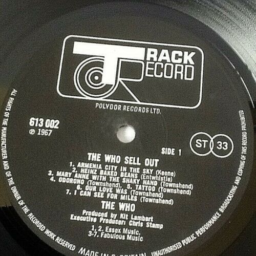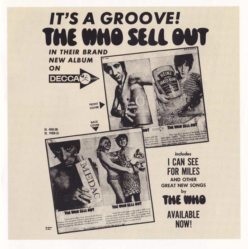 "I Can See for Miles" was released as a single and peaked at #10 in the UK and #9 in the US. Original vinyl copies of Sell Out end with an audio oddity that repeats into a locked groove. The music in the locked groove is an instrumental version of what was originally intended to be a vocal jingle for The Who's U.K. label Track Records.