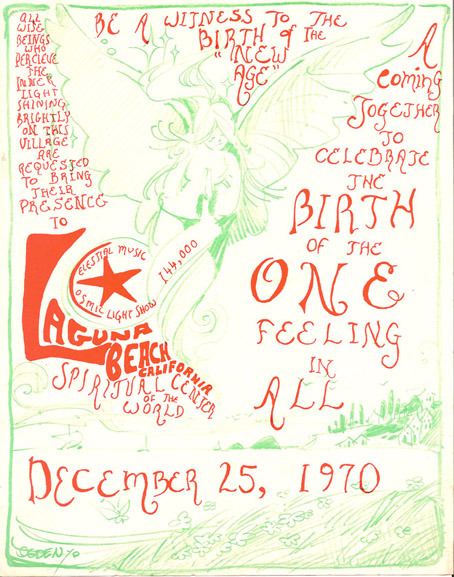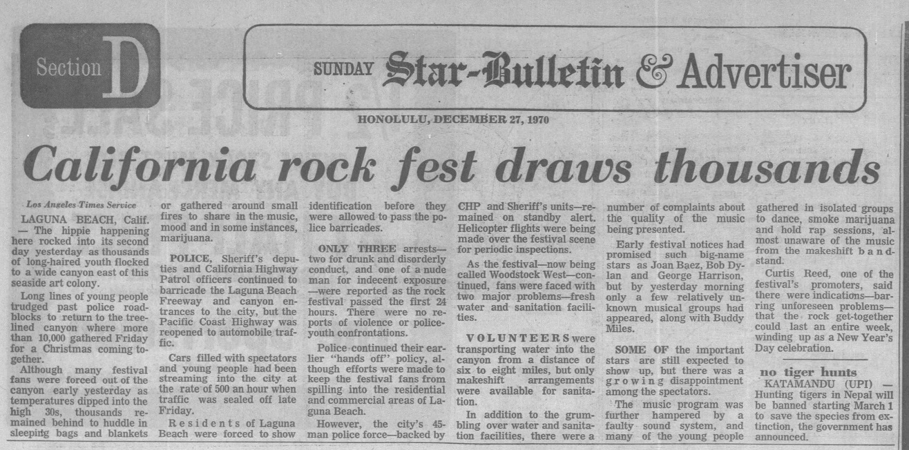 What had been no more than a invitation to come to Laguna Beach for a spiritual event at an unnamed location on a cold winter family holiday, without entertainment, suddenly exploded into a major event. A rebirth of Spirit transcending the tragedy of Altamont [...] A year after Altamont the L.A. Times headlined the Laguna event for four days, and called it 'Woodstock West', and said that the two days of peace and love more than merited the comparison."