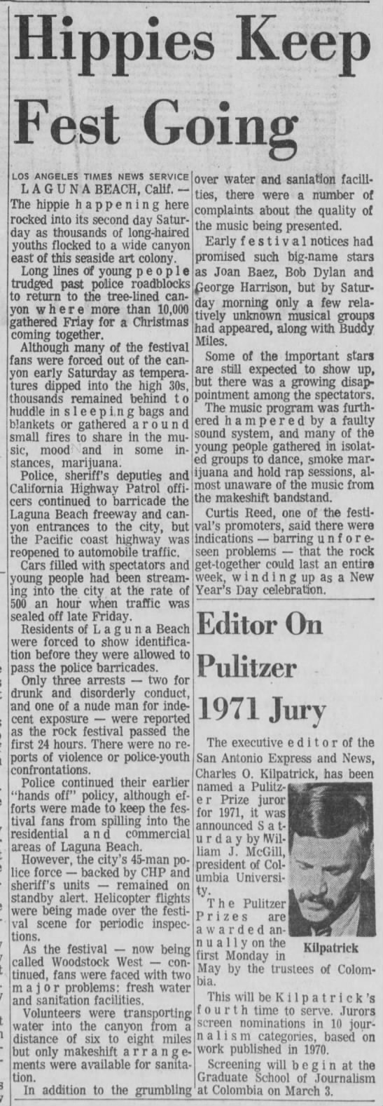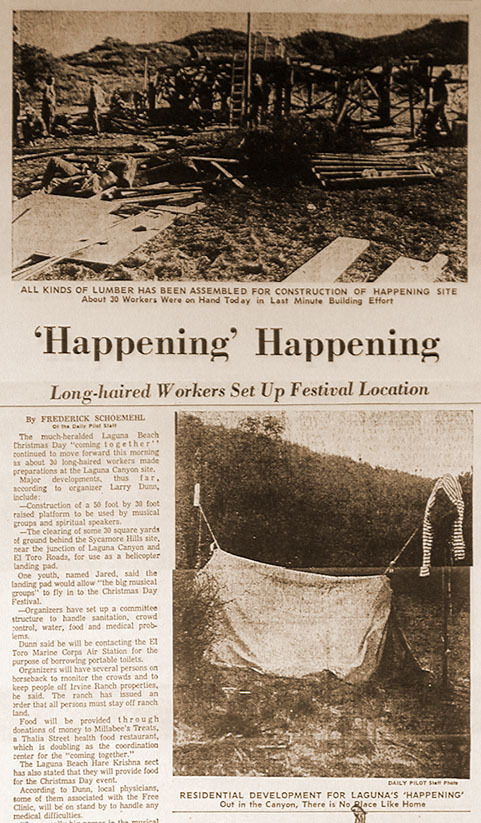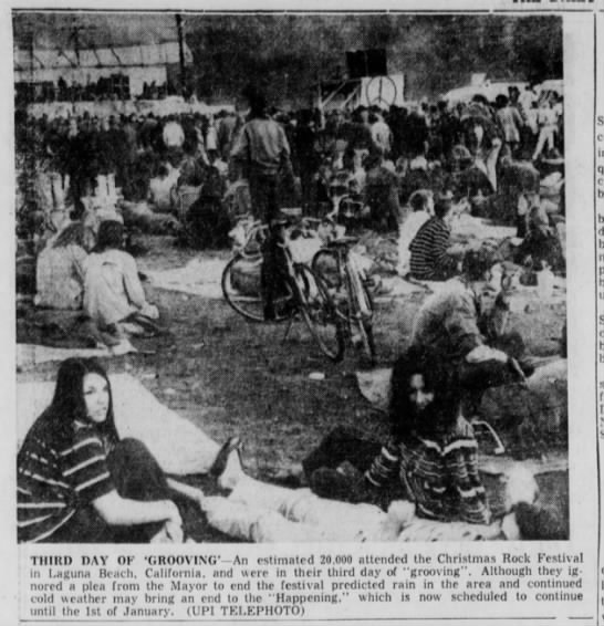 By mid-December 1970 word of mouth about the planned festivities had gotten around Orange County, then all over the LA area (Art Kunkin, editor and owner of the LA Free Press, donated six full pages of ads), and soon the rings spread outside California. No one knew exactly what was going to happen, yet in the post-Woodstock daze (and despite Altamont), the locale and timing struck a chord among young hippies, who embarked on journeys from remote parts of the US to join the Laguna Christmas party. It’s worth noting that this occurred without the draw of any major rock music names; like the early San Francisco gatherings, the Happening wasn’t a “rock festival”, but simply... a happening! This didn’t keep rumors about famous participants from spreading, perhaps fuelled by the cunning arrangers. As the buzz became louder, the good towns-people were getting increasingly nervous.