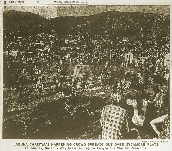 On this morning 40 years ago, hippies from all over California and beyond were massing in caravans that lined for miles on Pacific Coast Highway in both directions. They were gathering for a rock concert that originally had been billed as a "birthday party for Jesus" but which quickly became known as either the "Christmas Happening" or "The Great Happening." The concert, which was held in a grassy bowl at the top of Laguna Canyon known as Sycamore Flats, began on Christmas Day and ended three days later when hundreds of police officers and sheriff's deputies, who had already blocked off the town with barricades, forced stragglers onto buses and used bulldozers to bury everything left behind.