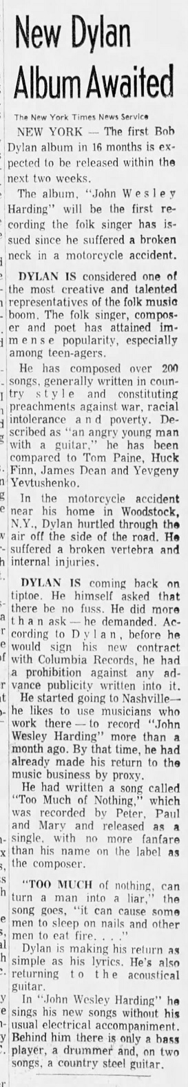 The album, as was expected, is called John Wesley Harding (Columbia CL 2804). The cover photo is Dylan in the woods somewhere (possibly Woodstock?) with three friends. The wire has it these are members of the group Albert Grossman (Dylan's manager) imported last fall from India. Personally, I prefer to think of them as two of the original scouts for the Lewis & Clarke Expedition with Kit Carson in the background.