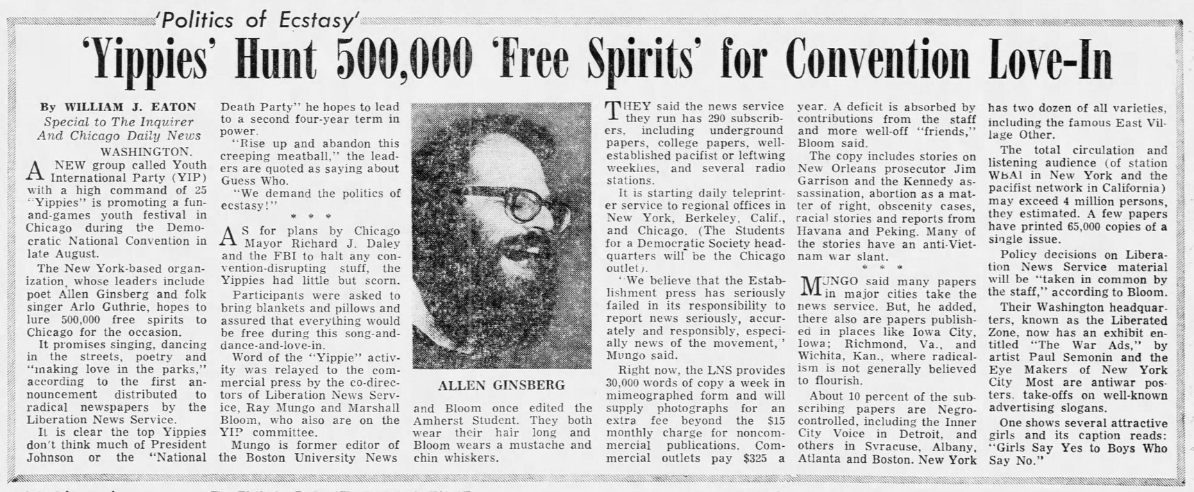 The Yippies held their first press conference in New York at the Americana Hotel March 17, 1968, five months before the August 1968 Democratic National Convention in Chicago. Judy Collins sang at the press conference. The Chicago Sun-Times reported it with an article titled: "Yipes! The Yippies Are Coming!"