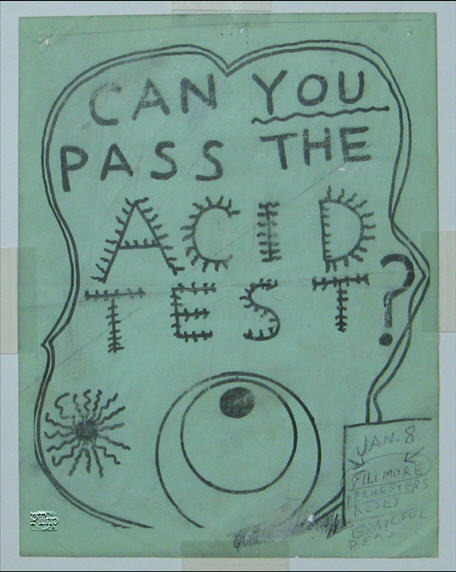 "...The Pranksters had just held an acid test at the Fillmore Auditorium, a big ballroom in the middle of one of San Francisco's big negro slums, the Fillmore district. It was a wild night. Hundreds of heads and bohos from all over the Bay area turned out, zonked to the eyeballs. Paul Krassner was back in town and he heard the word that was out on ...The Scene. Everybody would be "dropping acid" around 5 or 6 P.M. to get ready for the Acid Test to begin that night at nine o' clock at the Fillmore Auditorium. Krassner arrives and ---shit!---he sees: ...a ballroom surrealistically seething with a couple of thousand bodies stoned out of their everloving bruces in crazy costumes and obscene makeup with a racous rock n roll band and stroboscope lights and a thunder machine and balloons and heads and streamers and electronic equipment and the back of a guy's coat proclaiming "Please don't believe in Magic" to a girl dancing with four inch eyelashes so that even the goddamn Pinkerton Guards were contact high." Kesey asks him to take the microphone and contribute to a running commentary on the Scene. "All I know", he announces into the din, "is that if I were a cop and I came in here, I wouldn't know where to begin". Well the cops came in, and they didn't know where to begin. They came in to close the Test down at 2 A.M. in keeping with the local ordinance and the whole thing was at it's maddest height. Mountain Girl had hold of a microphone and was shrieking encouragement to the flailing dancers. Babbs was beaming spotlights at heads who were veering around bombed and asking them spectral questions over another microphone. ---Say there---What's you're trouble---have you lost your mi-i-i-i-nd! Page Browning was grinning Zea-lot. The cops started shouting for them to close down but couldn't make themselves heard and started pulling plugs out, microphone plugs, loudspeaker plugs, strobe plugs, amplifier plugs---but there were so many goddamn plugs, the most monumental snake pit of wires and plugs in history, and as fast as they would pull 8 plugs out, Mountain Girl would put 10 plugs back in, and finally Mountain Girl had a microphone up on the balcony somewhere and was screaming instructions to the dancers and the cops, louder music--more wine!---and they couldn't find her. Finally they ordered the Pranksters to start clearing the place out, which they did, except for Babbs, who sat down in a chair and wouldn't budge. "We said get busy", said the cops. "I don't have to. I'm the boss here. They're working for me." "Yeah?" --- and one of the cops grabbs Babbs by a luminous vest he has on, succeeding only in seperating Babbs from the vest. Babbs, grinning maniacly but suddenly looming most large and fierce. "You're under arrest!" "For what?" "Resistin' " "Resistin' what?" "Your gonna come quietly or do we have to take you?" "Either way you want it" says Babbs, grinning in the most frightening manner now, like the next step is eight karate chops to the gizzards and giblets. Suddenly it is a Mexican standoff---with both sides glaring but nobody swinging a punch yet. It is a grand hassle, of course. At the last minute a couple of Kesey's lawyers arrive on the ecene and cool everything down and talk the cops out of it and talk Babbs out of it and it all rumbles away in the valley as part of the welthassle. - Electric Kool Aid Acid Test - Tom Wolfe - Pages 252-254