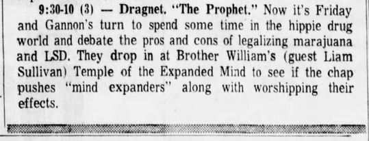 50th anniversary of "The Big Prophet" episode of Dragnet and 55th anniversary of Timothy Leary's attempt to buy a ridiculous amount of psychedelic drugs, including 1 gram of LSD, from Albert Hofmann today. Coincidentally he was doing so on Hofmann's birthday.