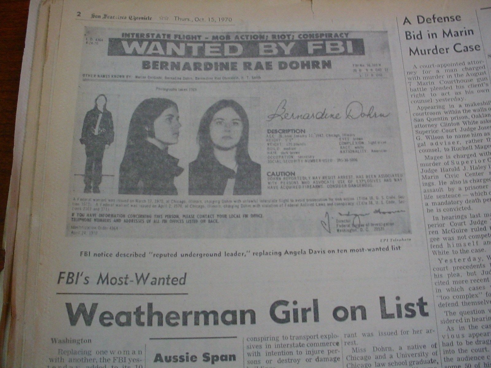In May 1970 Dohrn recorded and sent a transcript of a tape recording to the New York Times, the statement was a "declaration of a State of War" on behalf of the Weatherman. On October 14, 1970, Bernardine Rae Dohrn was added to the Federal Bureau of Investigations list of the 10 most wanted Fugitives. Bernardine Dohrn had several alias, which included, Bernardine Rae Ohrnstein, H.T. Smith, and Marion Del Gado. The Federal Bureau of Investigations removed Bernardine Dohrn from its "most wanted list" in December 1973 after a District Judge Damon J. Keith dismissed the case against the Weatherman. On January 3, 1974, a U.S. District Court Judge Julius J. Hoffman dismissed a 4-year-old case against 12 members of the Weatherman faction of the Students for a democratic Society, which included Bernardine Dohrn; she was charged with leading the riotous "Days of Rage"