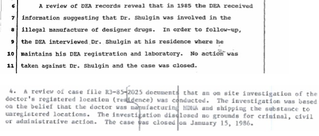 4. A review of case file R3-85 2025 document that an on site investigation of the doctor's registered location (residence) was conducted. The investigation was based on the belief that the doctor was as manufacturing MDMA and shipping the substance to unregistered locations. The investigation disclosed no grounds for criminal, civil or administrative action. The case as closed on January 15, 1986.
