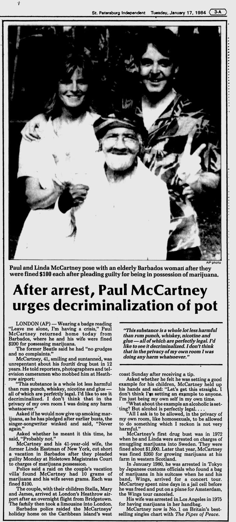 In 1984, while McCartney was on holiday in Barbados, authorities arrested him for possession of marijuana and fined him $200. Upon his return to England, he stated: "cannabis is ... less harmful than rum punch, whiskey, nicotine and glue, all of which are perfectly legal ... I don't think ... I was doing anyone any harm whatsoever." In 1997, he spoke out in support of decriminalisation of the drug: "People are smoking pot anyway and to make them criminals is wrong." He did however, decide to quit cannabis in 2015, citing a desire to set a good example for his grandchildren.