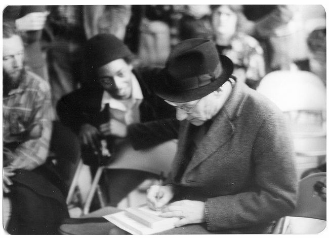 William S. Burroughs and James Grauerholz in the alley behind the Jazzhaus in Lawrence, Kansas (1996).Burroughs moved to Lawrence, Kansas, in 1981 and lived the remainder of his life there, at 1927 Learnard Avenue. He once told a Wichita Eagle reporter that he was content to live in Kansas, saying, “The thing I like about Kansas is that it’s not nearly as violent, and it’s a helluva lot cheaper. And I can get out in the country and fish and shoot and whatnot.” In 1984 he signed a seven-book deal with Viking Press after he signed with literary agent Andrew Wylie. This deal included the publication rights to the 1953 unpublished novel Queer. With this money he purchased a small bungalow for $29,000. He was finally inducted into the American Academy and Institute of Arts and Letters in 1983 after several attempts by Allen Ginsberg to get him accepted. He attended the induction ceremony in May 1983. Lawrence Ferlinghetti remarked the induction of Burroughs into the Academy proved Herbert Marcuse's point that capitalistic society had a great ability to incorporate its one-time outsiders.