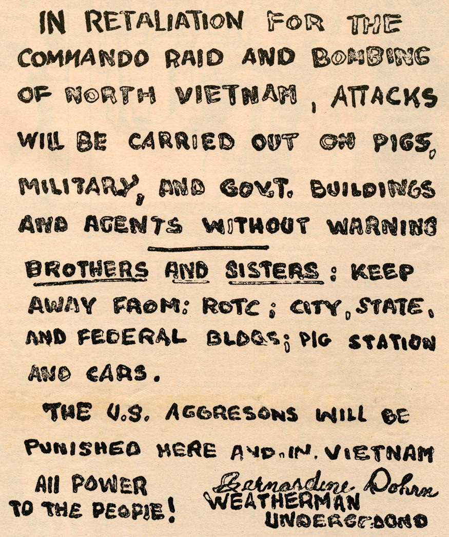 The so-called Weathermen were a radical faction of the Students for a Democratic Society (SDS); the Weathermen advocated violent means to transform American society. The philosophical foundations of the Weathermen were Marxist in nature; they believed that militant struggle was the key to striking out against the state to build a revolutionary consciousness among the young, particularly the white working class. Their primary tools to achieving these ends were arson and bombing. Among the other targets of Weathermen bombings were the Long Island Court House, the New York Police Department headquarters, the Pentagon, and the State Department. No one was killed in these bombings, because the bombers always called in an advanced warning. However, three members of the Weather Underground died on March 6, 1970, when the house in which they were constructing the bombs exploded.