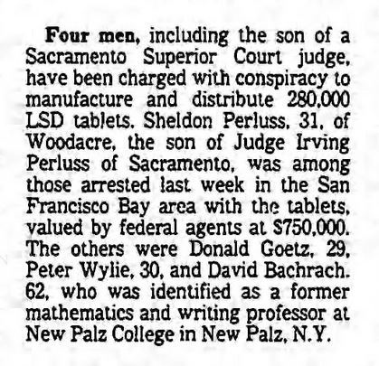 - 1979: Peter Wylie, Sheldon Perluss and David Bachrach are arrested for LSD manufacturing and distribution