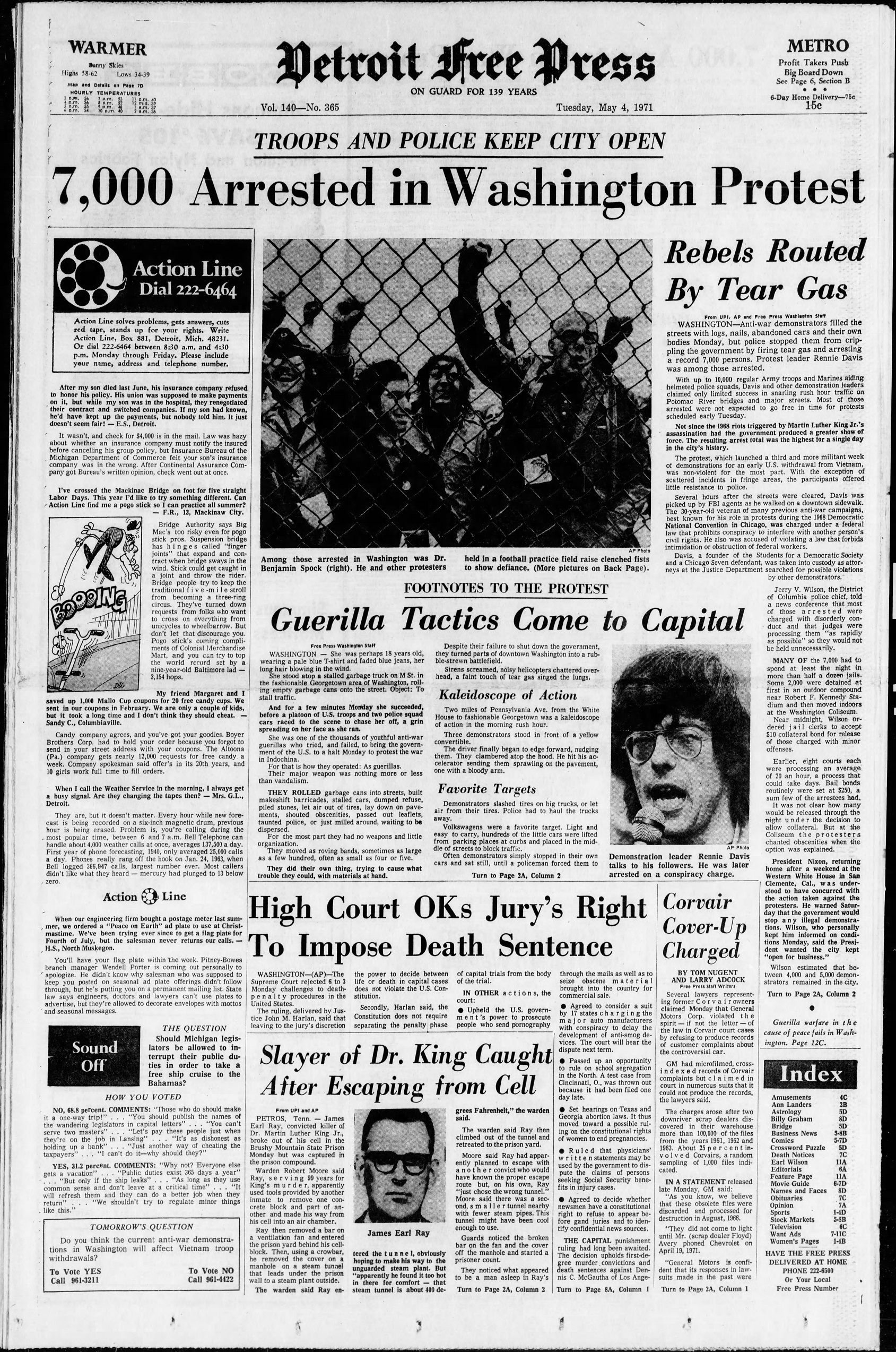 The 1971 May Day Protests were a series of large-scale civil disobedience actions in Washington, D.C., in protest against the Vietnam War. These began on May Day of that year, continued with similar intensity into the morning of May 3rd, then rapidly diminished through several following days.