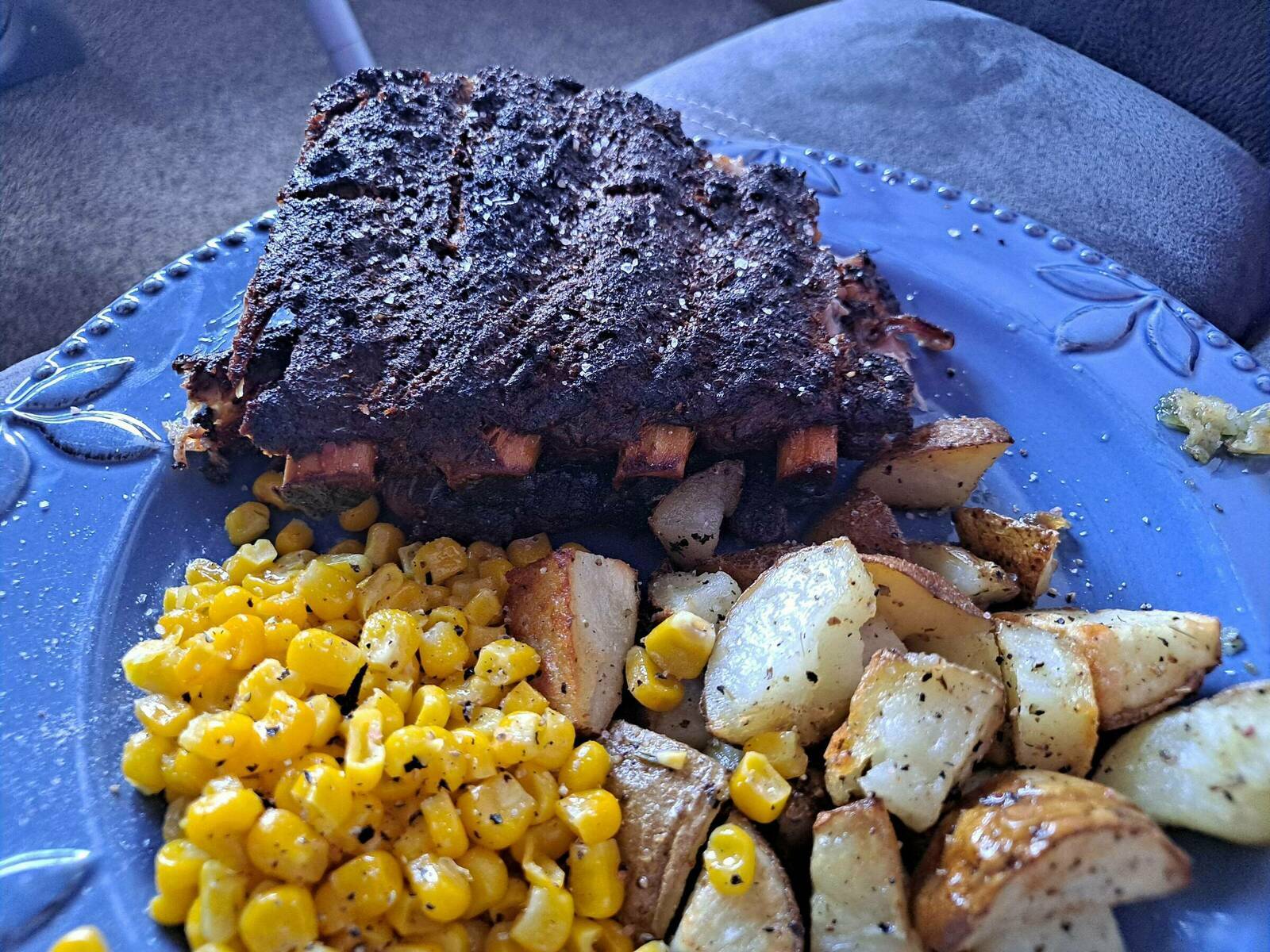 Hickory smoked ribs , bag of frozen sweet corn :P And diced potato bake