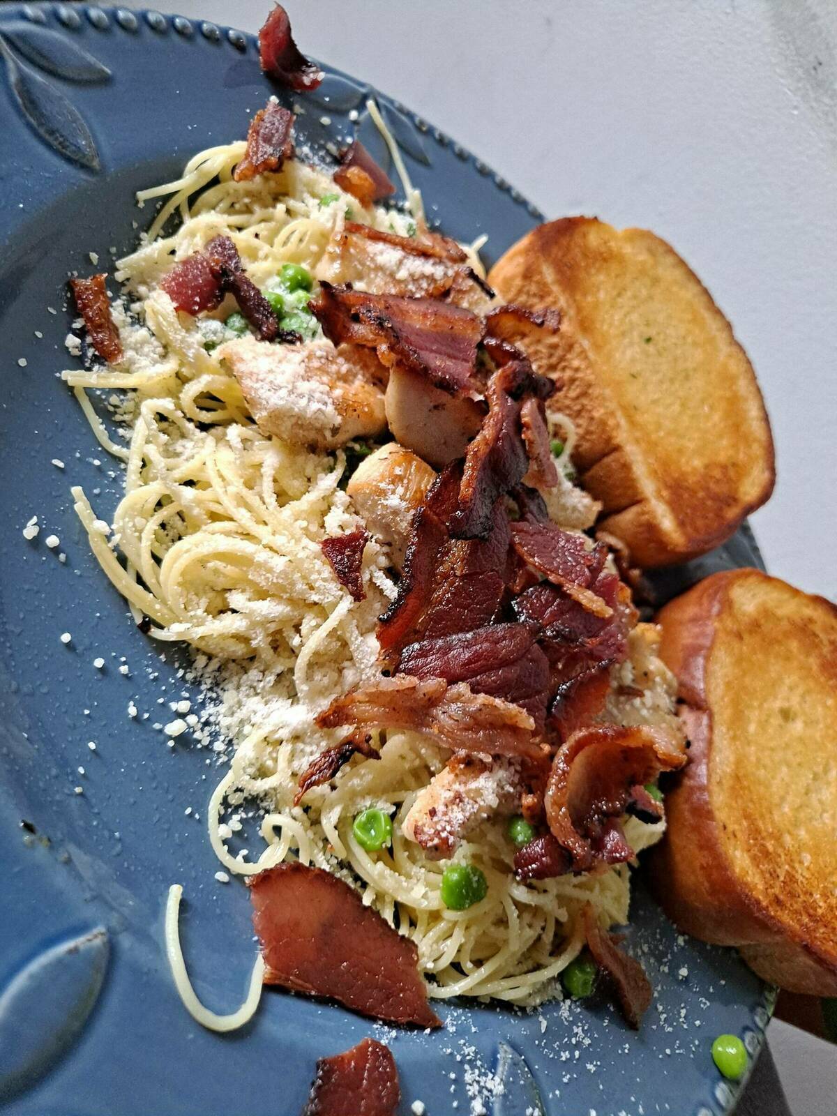 Sautéed chicken, hickory smoked bacon, parm garlic angel hair noodles n peas, some garlic bread