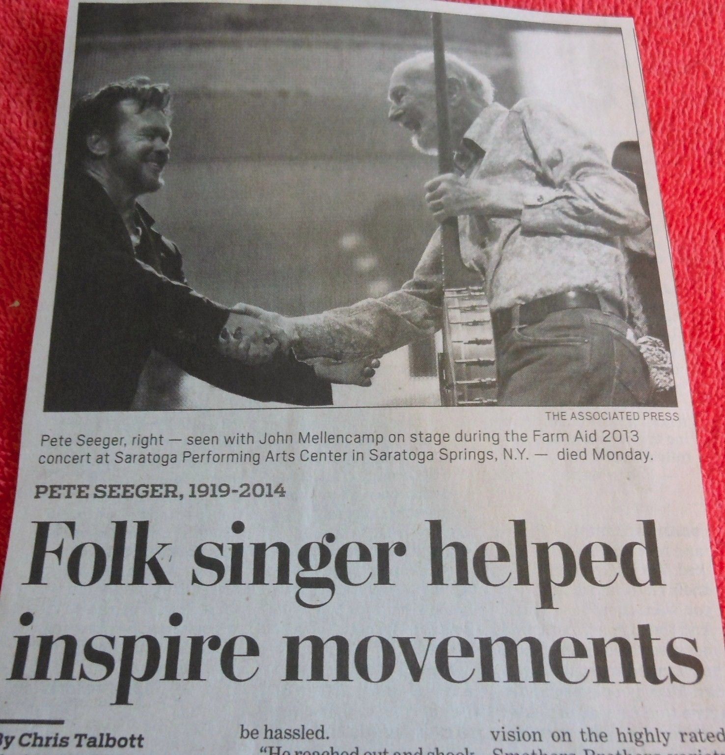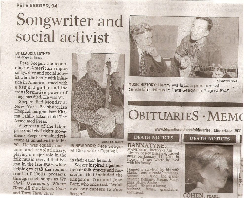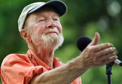 Peter "Pete" Seeger (May 3, 1919 – January 27, 2014) was an American folk singer. A fixture on nationwide radio in the 1940s, he also had a string of hit records during the early 1950s as a member of The Weavers, most notably their recording of Lead Belly's "Goodnight, Irene", which topped the charts for 13 weeks in 1950. Members of The Weavers were blacklisted during the McCarthy Era. In the 1960s, he re-emerged on the public scene as a prominent singer of protest music in support of international disarmament, civil rights, counterculture, and environmental causes.