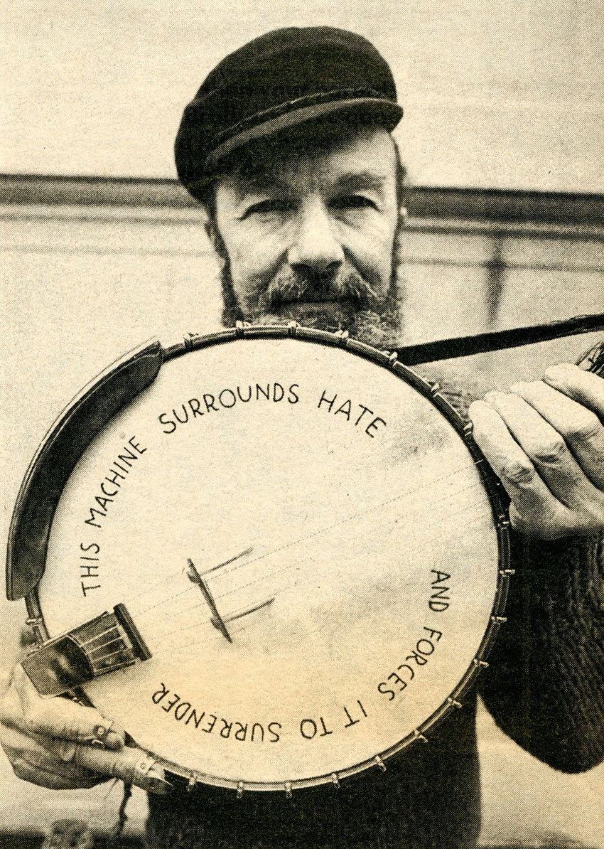 Inspired by Woody Guthrie, whose guitar was labeled "This machine kills fascists",photo Seeger's banjo was emblazoned with the motto "This Machine Surrounds Hate and Forces It to Surrender.