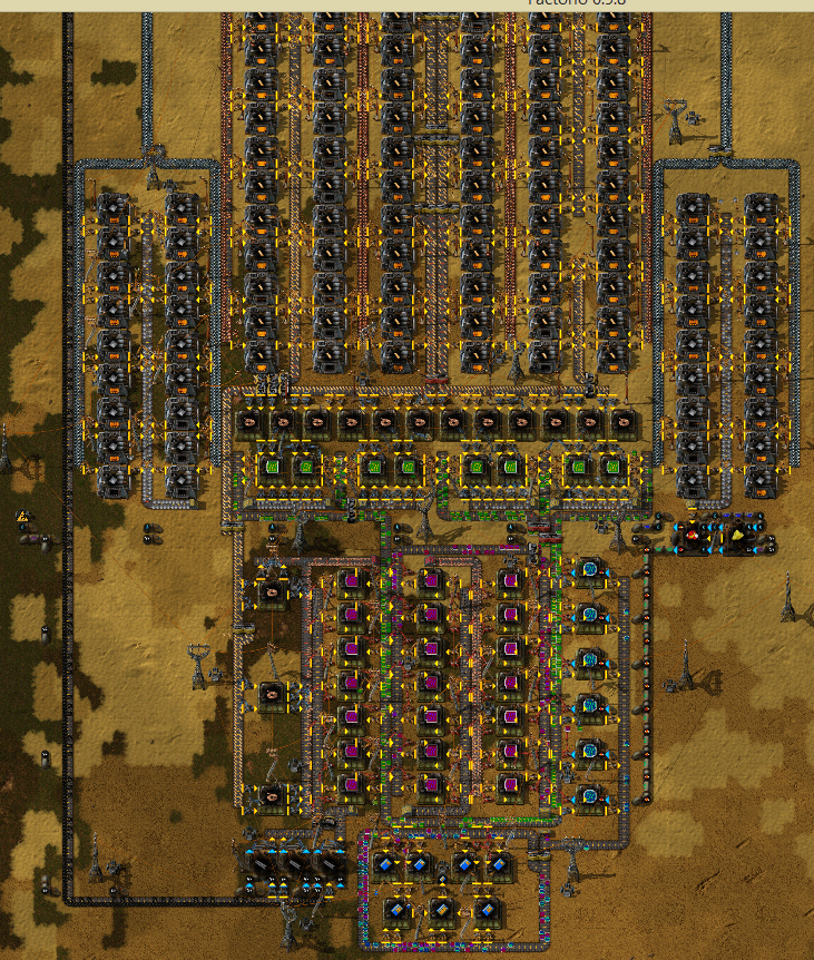 I've also been playing around with an idea floated on the forums by Gertibrumm, of a circulatory factory. It seems fairly inefficient for high volume production, but I really like it for high input, low output goods. Stuff like buildings, engines, that sort of thing. Everything is constantly circulated on a loop everywhere, so making a new thing is a easy as putting down a factory and hooking it up to the circuit system. It's somewhat belt-heavy, and a bit daunting to set up. Resist the urge to put ore on the belt and have smelters in odd places. It is nearly impossible to manage the required throughput without blue belts, and very well may be with blue belts.