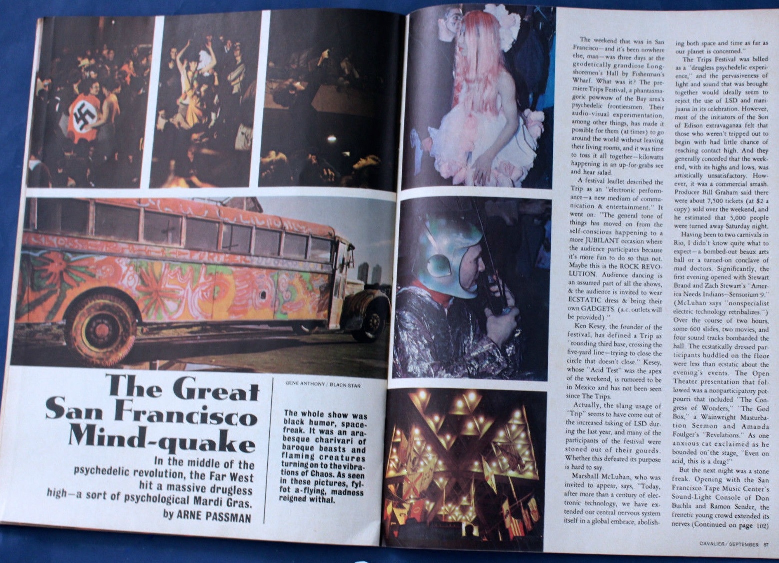 Despite all this, Friday, which was devoted to local theatricals and the Sensorium, was dull. "A bust, a bore, a fake, a fraud, a bum trip," lamented the Chronicle's Ralph Gleason in his "On The Town" column. Gleason, who had come expecting the "unspeakable delights" promised by Jerry Mander's publicity, described how "one of the frustrated customers got on stage halfway through the dull evening and said, unselfconsciously, 'this is a bore even on acid.' A little while later, the guy behind me said to his partner, 'let's go out in the car and listen to the radio.' It seemed like a bright idea." But Saturday, which belonged to the Pranksters, redeemed Gleason's opinion of the Trips Festival. It reminded him of a book called The Circus of Dr. Lao. "The place was jammed with a congeries of exotics Dr. Lao would have been proud to exhibit," he marveled. "There was a man bandaged all over, with only his eyes peeking out through dark glasses, carrying a crutch and wearing a sign: