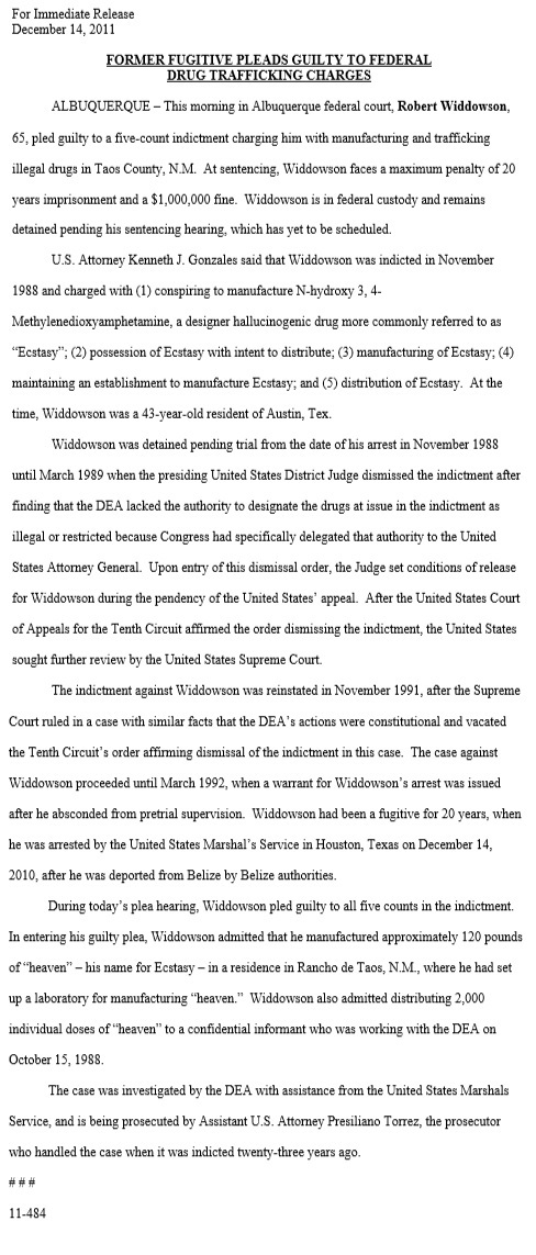 ALBUQUERQUE -This morning in Albuquerque federal court, Robert Widdowson, 65, pled guilty to a five-count indictment charging him with manufacturing and trafficking illegal drugs in Taos County, N.M. At sentencing, Widdowson faces a maximum penalty of 20 years imprisonment and a $1,000,000 fine. Widdowson is in federal custody and remains detained pending his sentencing hearing, which has yet to be scheduled. U.S. Attorney Kenneth J. Gonzales said that Widdowson was indicted in November 1988 and charged with (1) conspiring to manufacture N-hydroxy 3, 4- Methylenedioxyamphetamine, a designer hallucinogenic drug more commonly referred to as "Ecstasy"; (2) possession of Ecstasy with intent to distribute; (3) manufacturing of Ecstasy; (4) maintaining an establishment to manufacture Ecstasy; and (5) distribution of Ecstasy. At the time, Widdowson was a 43-year-old resident of Austin, Tex. Widdowson was detained pending trial from the date of his arrest in November 1988 until March 1989 when the presiding United States District Judge dismissed the indictment after finding that the DEA lacked the authority to designate the drugs at issue in the indictment as illegal or restricted because Congress had specifically delegated that authority to the United States Attorney General. Upon entry of this dismissal order, the Judge set conditions of release for Widdowson during the pendency of the United States' appeal. After the United States Court of Appeals for the Tenth Circuit affirmed the order dismissing the indictment, the United States sought further review by the United States Supreme Court. The indictment against Widdowson was reinstated in November 1991, after the Supreme Court ruled in a case with similar facts that the DEA's actions were constitutional and vacated the Tenth Circuit's order affirming dismissal of the indictment in this case. The case against Widdowson proceeded until March 1992, when a warrant for Widdowson's arrest was issued after he absconded from pretrial supervision. Widdowson had been a fugitive for 20 years, when he was arrested by the United States Marshal's Service in Houston, Texas on December 14, 2010, after he was deported from Belize by Belize authorities. During today's plea hearing, Widdowson pled guilty to all five counts in the indictment. In entering his guilty plea, Widdowson admitted that he manufactured approximately 120 pounds of -heaven" - his name for Ecstasy - in a residence in Rancho de Taos, N.M., where he had set up a laboratory for manufacturing "heaven." Widdowson also admitted distributing 2,000 individual doses of "heaven" to a confidential informant who was working with the DEA on October 15, 1988. The case was investigated by the DEA with assistance from the United States Marshals Service, and is being prosecuted by Assistant U.S. Attorney Presiliano Torrez, the prosecutor who handled the case when it was indicted twenty-three years ago. 11-484