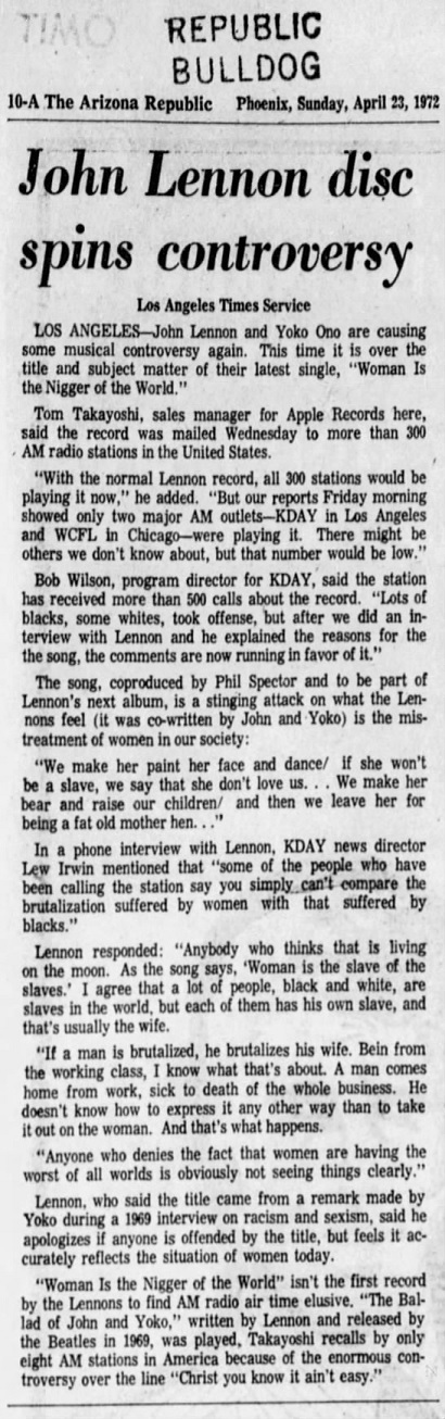 45th anniversary of John's "Woman Is the Nigger Of The World" single.