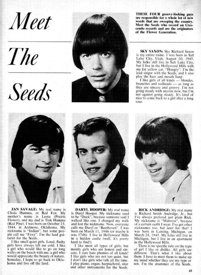 In 1965, Saxon founded the psychedelic flower power band The Seeds with Jan Savage (guitar), Rick Andridge (drums) and Darryl Hooper (keyboards). Hit songs for Saxon and the Seeds included "Can't Seem to Make You Mine", "Mr. Farmer" and "Pushin' Too Hard," which became a top 40 song and enduring rock anthem in 1967. Saxon's singing performance has been dismissed by critics like Lester Bangs as an American imitation of Mick Jagger, while others considered it a more complicated synthesis of Jagger, Eddie Cochran and Buddy Holly. The music on the Seeds 1966 albums The Seeds (GNP Crescendo 2023) and A Web of Sound (GNP Crescendo 2033) have been described as "weird psychotic blues highlighting Sky's demented, vocal sermonizing."