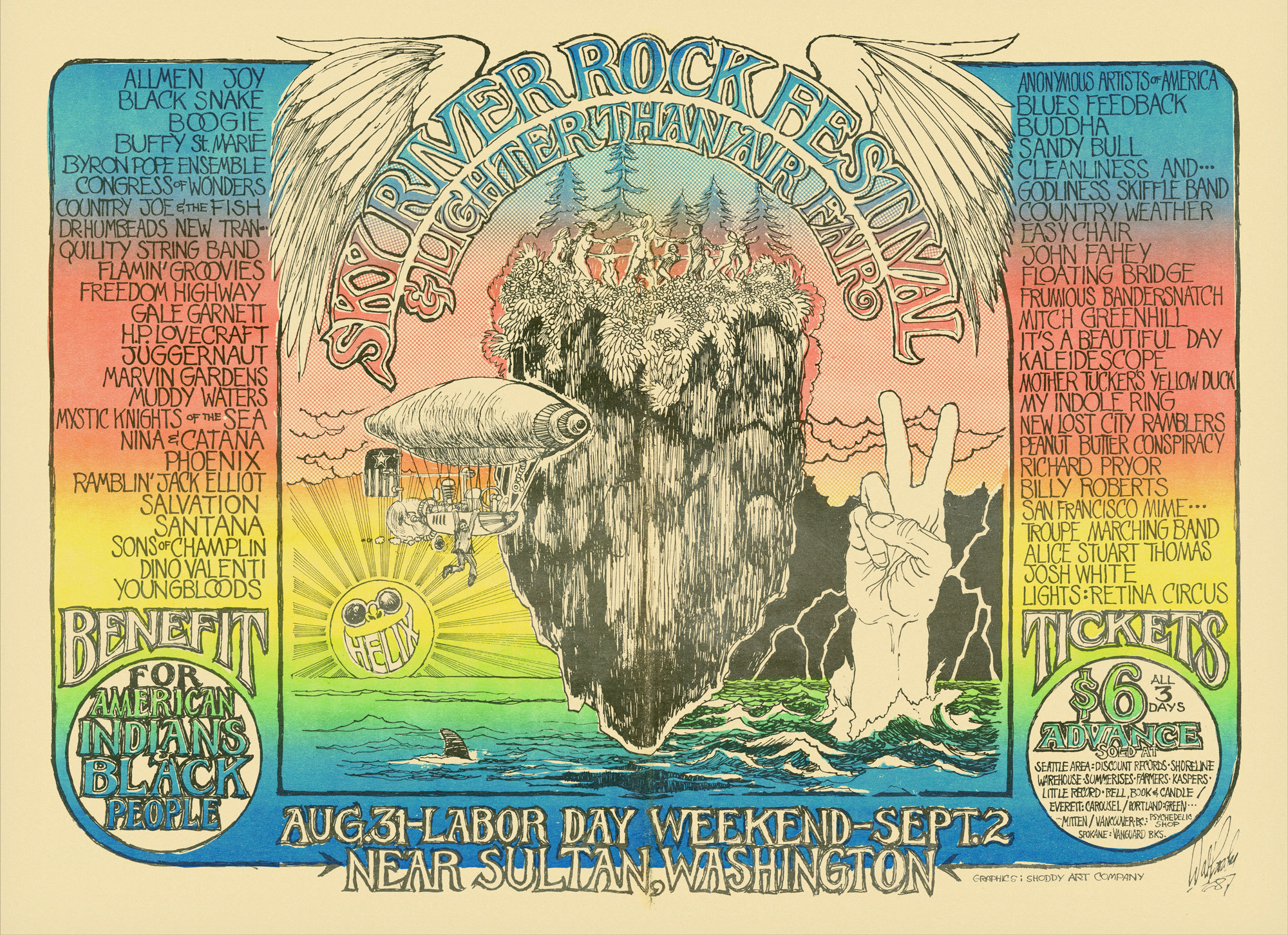 The festival was held Labor Day Weekend August 30 and September 1, 1969, in Tenino, Washington. The lineup had James Cotton, Country Joe and the Fish, Flying Burrito Brothers, Buddy Guy, Dan Hicks and His Hot Licks, Dr. Humbead's New Tranquility String Band, Kaleidoscope, Mississippi Fred McDowelll, The Steve Miller Band, New Lost City Ramblers, Pacific Gas & Electric, Billy Roberts, Sons of Champlin, Mark Spoelstra, Youngbloods, and many others. "Dr. Humbead's New Tranquility String Band and Medicine Show" consisted of Sue Draheim, Jim Bamford, Mac Benford, and Will Spires.[7][8] Steve Miller Band 1969