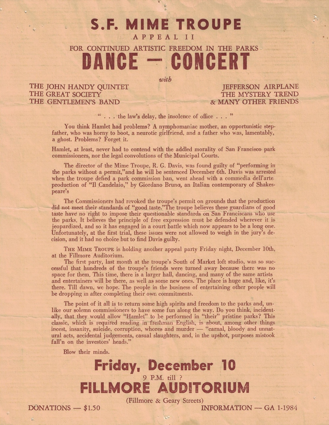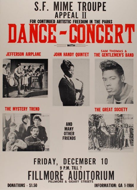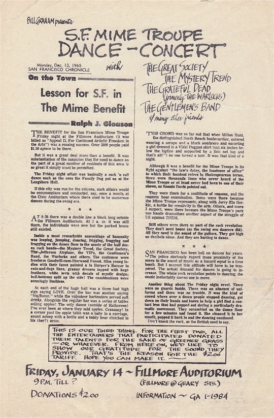 Mime Troupe Benefit - first show as "The Grateful Dead" - also: Jefferson Airplane; The Great Sciety; John Handy Quintet; The Mystery Trend; The Gentlemen's Band