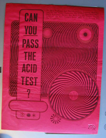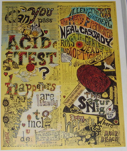 "The third Acid Test was scheduled for Stinson Beach, 15 miles north of San Francisco. Stinson Beach was already a gathering place for local heads. You could live all winter in little beach cottages there for next to nothing. There was a nice solid brick recreation hall on the beach, all very nice---but at the last minute that whole deal fell through and they shifted to Muir Beach, a few miles south. The handbills were already out, all over the head sections of San Francisco, Can YOU Pass the Acid Test?, advertising Cassady & Anne Murphey Vaudeville, and celebrities who might be there, which included anyone who happened to be in town, or might make it to town, the Fugs, Ginsberg, Roland Kirk. There were always some nice chiffon subjunctives and the future conditionals in the Prankster handbill rhetoric, but who was to deny who might be drawn into the movie.... Anyway, at the last minute, they headed for Muir Beach instead. The fact that many people wouldn't know about the change and would go to Stinson Beach and merely freeze in the darkness and never find the right place---somehow that didn't even seem distressing. It was part of some strange analogical order of the universe. Norman Hartweg hooked down his LSD---it was in the acid gas capsules that night---and thought of Gurdjieff. Gurdjieff wouldn't announce a meeting until thr last minute. We're gonna get together tonight. The people that got there, got there; and there was message in that alone. Which was, of course: you're either on the bus or off the bus. Those who were either on the bus, even if they weren't Pranksters, like Marshall Efron, the round Mercury of Hip California, or the Hell's Angels....all found it. The cops, however, did not. They were apparently thrown off by the Stinson Beach handbills. Muir Beach has a big log-cabin-style lodge for dances, banquets, and the like. The lodge was stilted up out in a waste of frigid marsh grass. A big empty nighttime beach in winter. Some little log tourist cabins with blue doors on either side, all empty. The lodge had three big rooms and was about 100 feet long, all logs and rafters and exposed beams, a tight ship of dark wood and Roughing It. The Grateful Dead piled in with their equipment and the Pranksters with theirs, which now included a Hammond electric organ for Gretch and a great strobe light. ...."To people standing under the mighty strobe, everything seemed to fragment. Ecstatic dancers---their hands flew off their arms frozen in the air---their glistening faces came apart---a gleaming ellipse of teeth here, a pair of buffered highlit cheekbones there---all flacking and fragmenting into images as in an old flicker movie---a man in slices!---All of history pinned up on a butterfly board; the experience, of course. The strobe, the projectors, the mikes, the tapes, the amplifiers, the variable lag Ampex---it was all set up in a coiling gleaming clump in the Lincoln Log lodge, the communal clump, Babbs working over the dials, talking into the microphones to test them. Heads beginning to pour in. Marshall Efron, and Norman, Norman already fairly zonked....Then in comes Kesey, through the main door--- Everyone watches. His face is set, his head cocked slightly. He is going to do something; everyone watches, because this seems terribly important. Drawn in right away by the charismatic vacuum cleaner, they are. Kesey heads for the control center, saying nothing to anyone, reaches into the galaxy of dials, makes...a single minute adjustment...yes! one toggle switch, double-pole, single-throw, double-break, in the allegory of control... Babbs is there, bombed, but setting up the intricate glistening coils of the tapes and projectors and the rest of it. Each of the Pranksters, bombed, has some fairly exacting task to do, Norman is staring at the dials---and he can't even see the numbers, he is so bombed, the numbers are wriggling off like huge luminous parasites under a microscope---but---function under acid. Babbs says, "One reason we're doing this is to learn how to function on acid." Of course! Prepare for the Day---when multitudes, millions, civilizations are on acid, seeking satori, it is coming, the wave is spreading. The heads are all sitting around on the floor, about 300 of them. Into the maelstrom! Yes, at Big Nig's in San Jose, a lot of the kids the Pranksters had corralled coming out of the Rolling Stone show did not take LSD that night, although there were enough heads at Big Nig's stoned on various things to create the sympathetic vibration known as the "contact high". But this is different. Practically everybody who has found the place, after the switch from Stinson Beach, is far enough into the thing to know what the "acid" in the Acid Test means. A high percentage took LSD about 4 hours ago, rode out the first rush and are ready...now to groove...The two projectors shine forth with The Movie. The bus and the Pranksters start rolling over the walls of the lodge, Babbs and Kesey rapping on about it, the Bus lumping huge and vibrating and bouncing in great swells of heads and color---Norman, zonked, sitting on the floor, is half frightened, half ecstatic, although something in the back of his mind recognizes this as his Acid Test pattern, to sit back and watch, holding on through the rush, until 3 or 4 A.M, in the magic hours, and then dance---but so much of a rush this time! The Movie and Roy Seburn's light machine pitching the intergalactic red science-fiction seas to all corners in the lodge, oil and water and food coloring pressed between plates of glass and projected in vast size so that the very ooze of cellular Creation seems to ectoplast into the ethers and then the Dead coming in with their immense submarine vibrato vibrating, garanging, from the Aleutian rocks to the baja griffin cliffs of the Gulf of California. The Dead's weird sound! Agony in ecstasis!, submarine somehow, turbid half the time, tremendously loud but like sitting under a waterfall, at the s