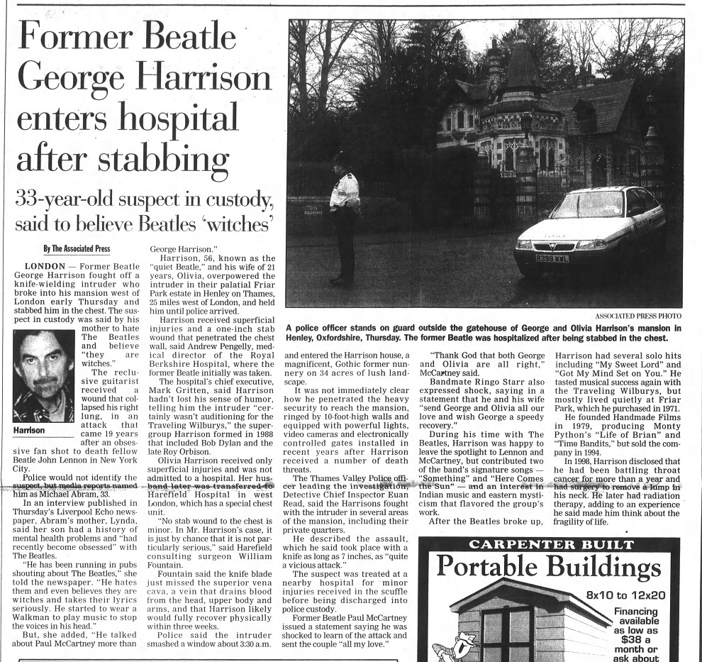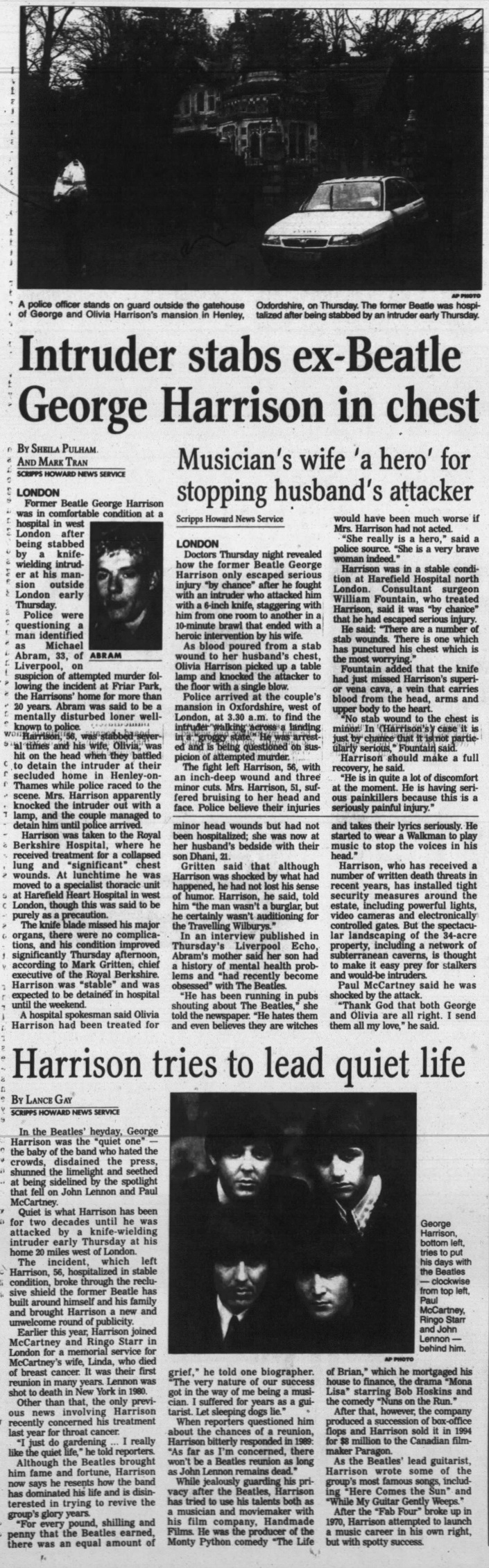As for the asshole who almost killed both George and his wife Olivia, the last trace I can find of him on the internet is from 2005. He was found not guilty by reason of temporary insanity and then released 2-1/2 years after stabbing George. In 2005, he was working somewhere called Citizens Advice Bureau. In Liverpool!