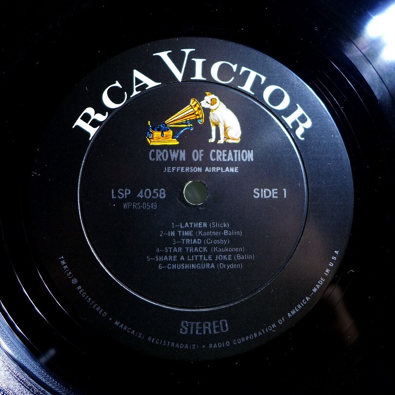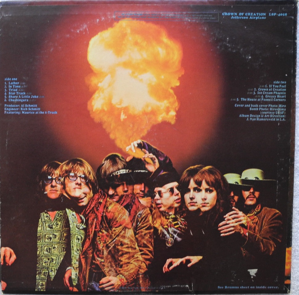 Crown of Creation was released in 1968 and is the fourth album by the San Francisco rock band Jefferson Airplane, released as RCA Victor LSP-4058 (stereo). A mono version was released only to radio in the US (as LPM-4058), but was released commercially in other countries. This was the last Jefferson Airplane album to be released in mono. In addition, although the cover features the newer "modern" RCA Victor logos, initial stereo pressings and all mono pressings were on the black "Nipper" label (instead of the orange label associated with those logos). The album peaked at number 6 on the album charts and was eventually certified gold. The David Crosby-penned "Triad" is the only track not composed by an Airplane member, except that the lyrics to the title song are based on lines from John Wyndham's novel The Chrysalids) - unattributed, but with his permission. "Triad" was previously rejected for release by Crosby's group The Byrds as being too risqué.