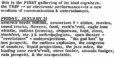 "The Trips Festival was a continuation of what was happening at other events, but in a much bigger dose," says Steve Brown, who was managing a local band called the Friendly Stranger at the time. "Our thing was we did a liquid light show, a fog machine and projected cartoons. We had all that environment thing going already. What this added to it was a more chaotic, unpredictable type of edge: tying everybody together with a string, turning off the lights, and throwing thousand of marshmallows down on everybody. Weird stuff that was sort of like performance art and got everybody participating. You'de be going along doing whatever you were doing and all of a sudden you'd find yourself in the middle of some other completely weired scene that somebody else was doing, so you did that until it ended or until something more interesting came along. And if a band happened to be playing and was good, that was an added bonus. The place was packed. There were people inside and outside, and people who didn't know if they were inside or outside. There were all these people just kind of bumping around Fisherman's Wharf scaring the tourists; it was great! What it really was, was a public drug event. Everyone was completely aghast that this many young people would want to do this. They couldn't believe it!" -- Garcia: American Life - Blair Jackson - Page 97