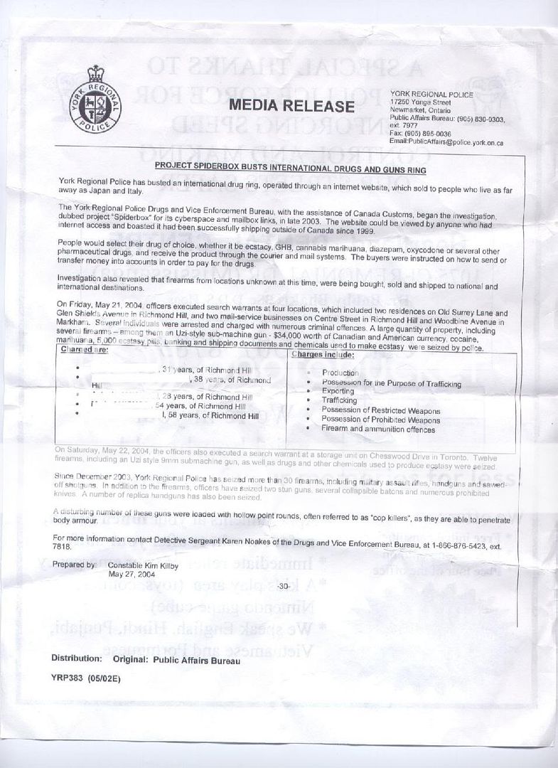 Police said they know guns and drugs were sold to people in Japan and Italy. Dubbed "Project Spiderbox" for its cyberspace and maibox links, York cops launched a probe late last year.